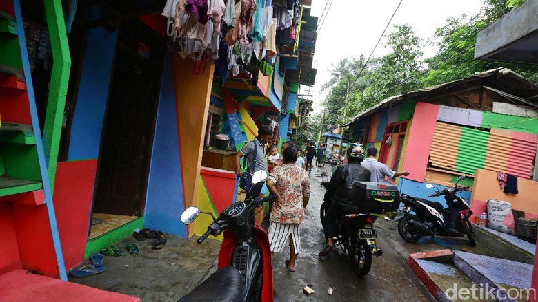 Siapa bilang di Jakarta cuma ada kampung kumuh, nih buktinya. Deretan rumah warna-warni berjajar rapi di bantaran kali Cipinang. Bukan cuma warna-warni, kampung ini juga bebas rokok! Wow, jempol deh.