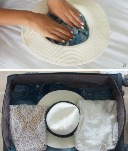 Sama seperti ruang pada sepatu, manfaatkan ruang kosong yang ada di topi pantaimu atau pasanganmu untuk memasukan kaos/baju, hal ini juga bermanfaat agar bentuk topimu tidak rusak saat bertumpukan dengan barang lainnya di koper.