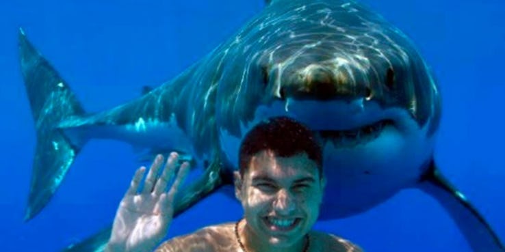 - Eh, tiba-tiba ada hiu yang mau ikut foto di bawah laut.