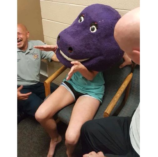 Cewek ini dateng ke markas pemadam kebakaran karena kepalanya nyangkut di kepala boneka Barney.