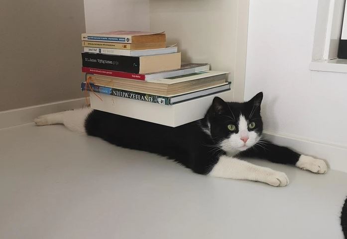 Enggak, ini bukan patung, cuma kucing lagi stretching di bawah tumpukan buku.