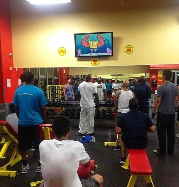 Capek-capek ngumpul di gym cuma buat nonton Spongebob, di rumah juga bisa woi.