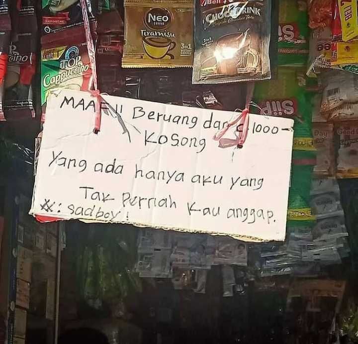 Yang Penting Heppiii. Bukan lagi hal yang aneh kalau ke warung selalu ada tempelan kertas yang berisi informasi atau pemberitahuan seputar warung tersebut atau bisa juga himbauan yang harus dilakukan pembeli. Tapi yang berikut ini lain, bukannya pake bahasa sederhana, mereka malah pake istilah-istilah yang cukup spesifik dan kocak, bikin yang dateng senyum-senyum sendiri.