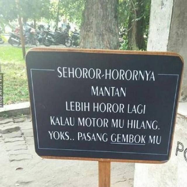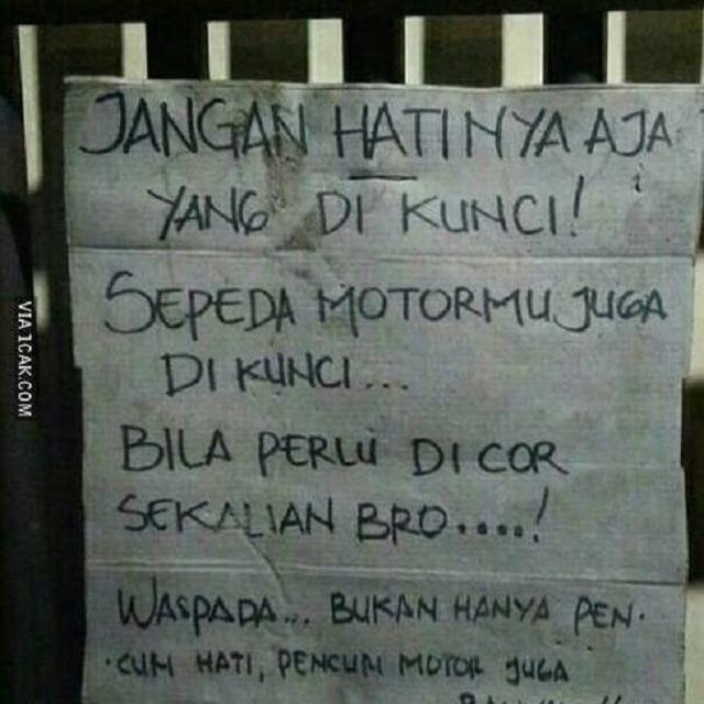 Yang Penting Heppiii. Sebuah papan peringatan seringkali kita lihat di tempat-tempat umum, kenapa? Ya biar tertib dong, kalau nggak ada peringatan, bisa kacau jadinya. Tapi karena biasanya kata-kata yang dipakai agak membosankan, jadi nggak heran kalo peringatan sering diabaikan. Nah biar diperhatikan, peringatan bisa dibikin lebih kocak, seperti yang tertangkap kamera berikut ini. Baca ya, paling penting patuhi juga.
