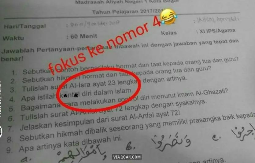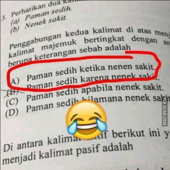 Yang Penting Heppiii. Kejadian salah ketik nggak cuma bisa terjadi ketika saling berkirim pesan lewat aplikasi chat. Typo atau salah ketik juga biasa ditemukan di tempat umum, tulisan peringatan atau bahkan pada soal ujian siswa. Parahnya, typo di soal ujian berikut ini bikin siswa yang udah pusing mikirin jawaban jadi tambah puyeng, karena semua artinya jadi ambigu. Seperti apa sih typonya? Yuk langsung lihat.