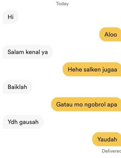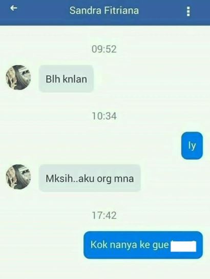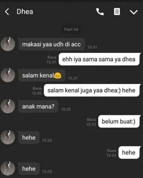 Yang Penting Heppiii. Memulai perkenalan dengan lawan jenis yang menarik perhatian bukan perkara mudah. Butuh keberanian untuk memulai percakapan saat berkenalan. Kalo sukses, bisa lanjut ke percakapan dengan topik ringan atau bahkan ajakan untuk bertemu. Sayangnya, nggak semua perkenalan berjalan mulus, kadang bisa aja canggung atau bahkan mancing emosi. Kaya perkenalan lewat chat berikut ini. Bukan makin akrab, malah menjelang di blok.