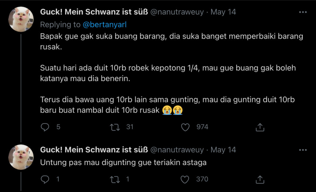 Yang Penting Heppiii. Selain wibawanya yang tinggi dan jokesnya yang sungguh garing, bapak-bapak juga terkenal sering banget melakukan hal-hal di luar dugaan yang sama sekali nggak kepikiran. Sayangnya kelakuannya tersebut kebanyakan malu-maluin. Curhatan warga Twitter tentang kelakuan bapak mereka masing-masing berikut ini semakin membuktikan kalau bapak-bapak emang absurd banget.