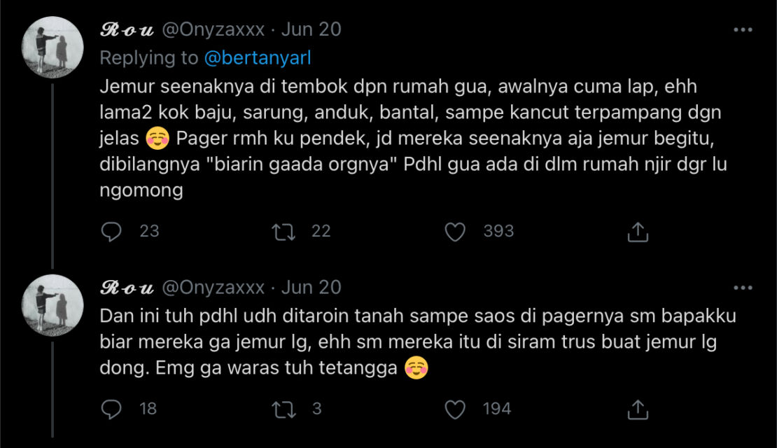 Yang Penting Heppiii. Kita ini adalah makhluk sosial yang hidup berdampingan dengan orang lain. Tapi pada kenyataannya, hidup berdampingan nggak semudah yang dibayangkan, apalagi di Indonesia, di mana ghibah adalah bagian dari budaya kita. Jadi jangan heran kalau ada aja yang dikomentarin. Simak nih, curhatan para netizen tentang kehidupan bertetangga mereka, ngeselin bener.