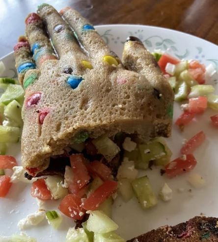 Udah cake nya bentuk horor, dicampur salad lagi. Astaga.