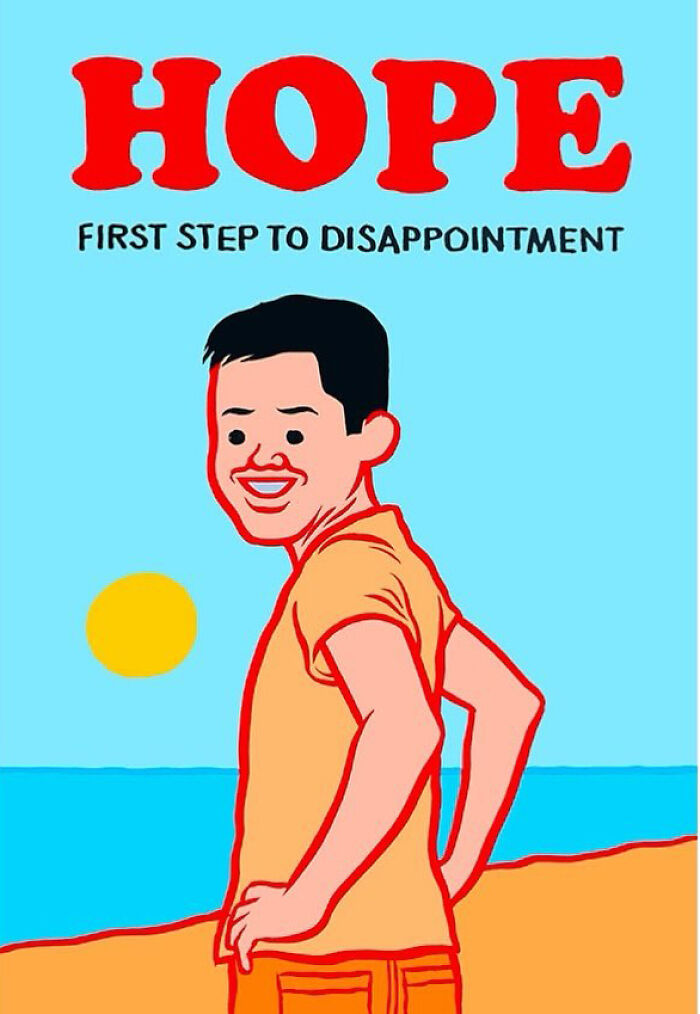 Yang Penting Heppiii. Kamu pasti nggak jarang lihat quote-quote motivasi atau kata-kata bijak yang bikin kamu jadi semangat dalam menjalani hidup. Tapi kadang kala, kamu juga skeptis dengan quote-quote tersebut. Wajar sih, karena kadang kata-kata motivasi tersebut kaya klise dan nggak real. Nah, seorang seniman Joan Cornella, seorang kartunis asal Spanyol mematahkan hal tersebut dan menampilkan selera humornya yang dark dan absurd.