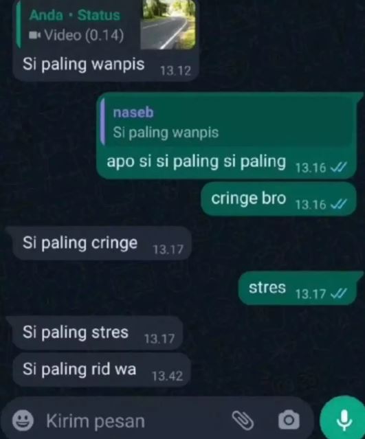 Yang Penting Heppiii. Tipe teman pada saat ngobrol di chat room seperti Whatsapp dan lain-lain itu bermacam-macam. Ada yang jarang buka Whatsapp, ada yang suka baca doang balesnya nanti-nanti. Yang paling ngeselin nih, bales nya cepet tapi jawaban-jawabannya bikin emosi. Tipe kaya gini beneran menguji kesabaran. Lihat deh, sederetan chat antar teman ini, jadi ikutan kesel bacanya.