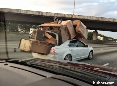 Lebih tinggi barang yang dibawa daripada mobilnya. Kasian.