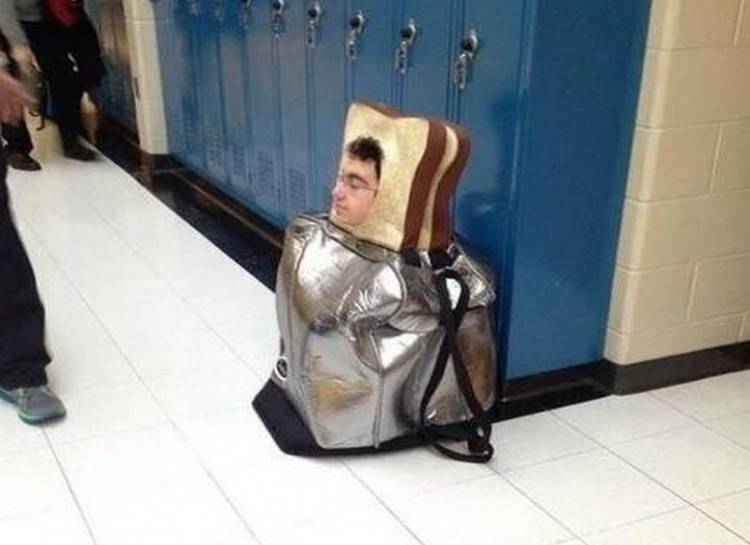 Nah ini ngapain? Istirahat siang bukannya makan, malah cosplay jadi tas bekal. Ckckck.