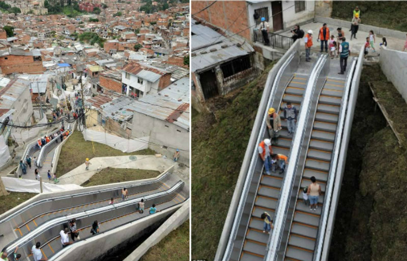 Tahun 2011, dibangun eskalator di perkampungan paling miskin di Colombia. Warga perkampungan diharuskan naik turun bukit setinggi kurang lebih 28 lantai gedung bertingkat setiap hari untuk waktu yang cukup lama. Sekarang mereka nggak perlu lagi capek-capek lagi melakukannya dan bisa menghemat waktu dari 35 menit ke 5 menit. Tingginya sekitar 40 meter dan dibagi menjadi 6 bagian yang makin memudahkan penduduk dari berbagai wilayah untuk mengakses eskalator ini.