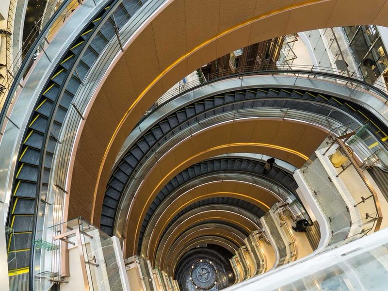 Ada eskalator "laser show" di pusat perbelanjaan Eropa di Moskow. Desain cross-over bukan sengaja dibuat, tapi lebih mengarah pada pendekatan teknik yang dimaksudkan untuk menghemat ruang, ternyata ide ‘tanpa sengaja’ ini justru bikin eskalatornya terlihat indah dilihat.