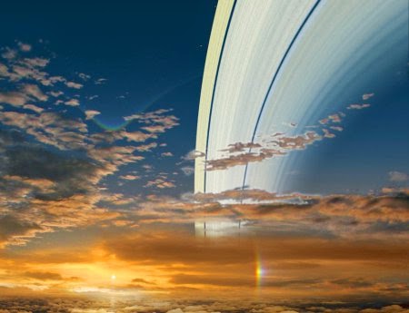 Gambar di atas adalah bagian troposfer Saturnus dibawah susunan cincin yang paling megah di tata surya. Cincin putih es melambung 75.000 kilometer di atas langit. Pemandangan ini langka dan indah banget!