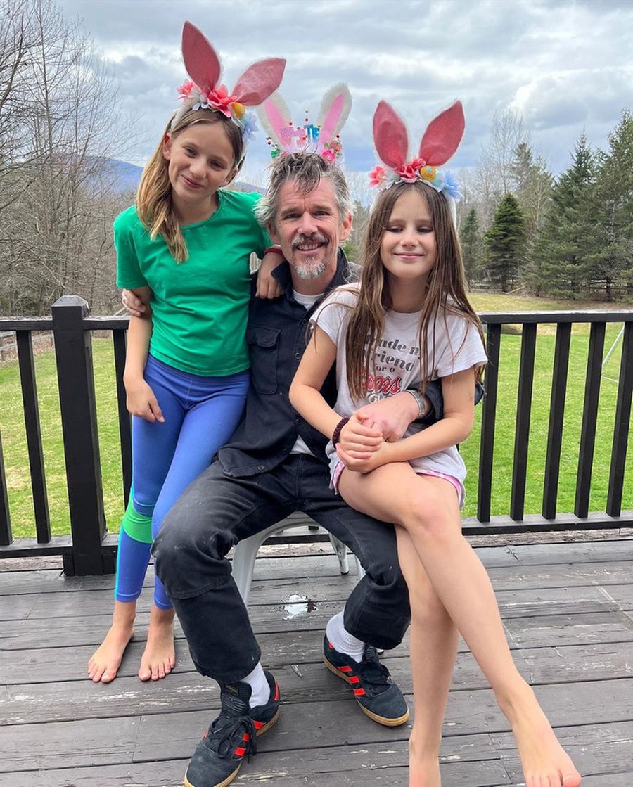 - Ethan hawke tampil kompak memakai bando berbentuk telinga kelinci yang diberi hiasan warna-warni.
