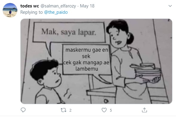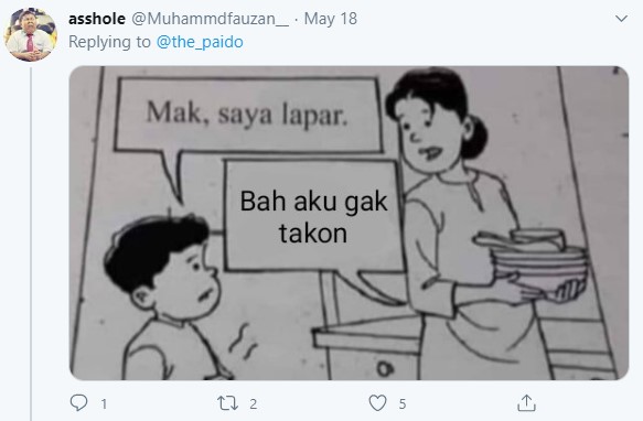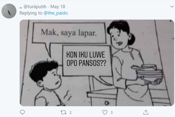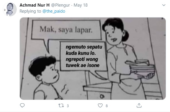Yang Penting Heppiii. Di Twitter sering banget muncul berbagai karakter orang dengan isi otak yang cukup absurd, tiba-tiba ngetweet hal yang nggak ada faedahnya. Kaya akun Twitter dengan nama the_paido ini, nggak ada angin nggak ada hujan tiba-tiba ngetweet sebuah gambar seorang wanita dan anaknya dengan template box obrolan kosong. Dan bukan netizen Indonesia kalau nggak ngrespon dengan cepat, bisa ditebak juga kalau kreasinya aneh-aneh banget. Simak yuk, beberapa diantaranya ditulis dalam bahasa Jawa. Ngeri dah.