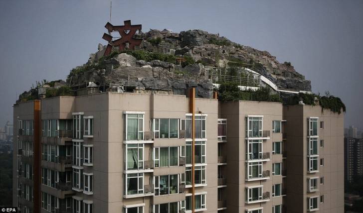 Vila gunung di China, pengusaha asal Beijing ini punya ide gila dengan membangun sebuah “gunung” di atap sebuah gedung apartemen.