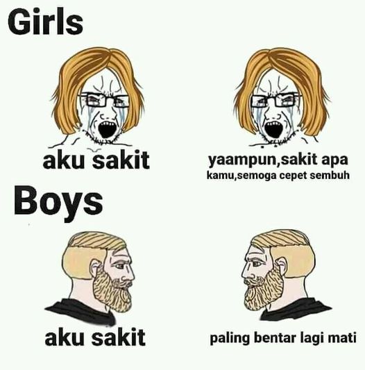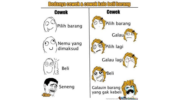 Yang Penting Heppiii. Bukan cuma fisik, kehidupan cowok dan cewek memang bagai bumi dan langit. Mulai dari aktifitas sehari-hari sejak bangun tidur sampai malam hari, pertemanan dan pergaulan, cara ngatur keuangan, sudut pandang, sampai kebiasaan, semuanya beda. Semua perbedaan itu terangkum dalam beberapa meme di bawah ini. Simak ya, kira-kira kamu ikut mengamini atau punya pendapat sendiri?