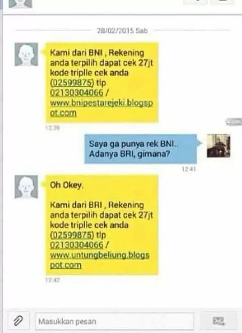 Kamu pasti pernah menerima SMS penipuan yang mengatakan bahwa kamu terpilih menjadi pemenang undian berhadiah A atau B, Atau SMS dari mama yang berada di kantor polisi lalu minta pulsa?