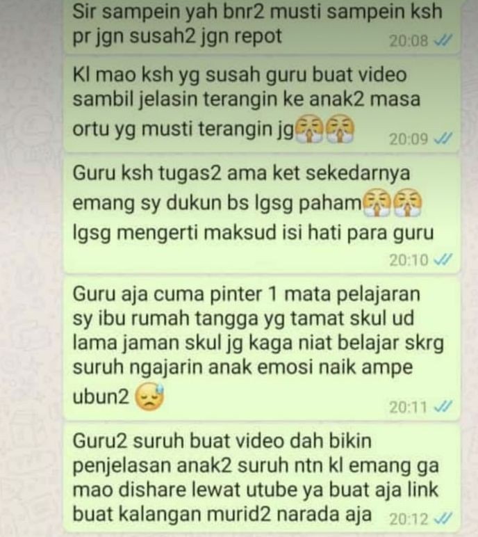Yang Penting Heppiii. Wabah pandemic corona mengharuskan anak-anak belajar di rumah. Langkah tersebut diambil untuk memutus mata rantai penyebaran virus corona di Indonesia. Tapi dalam pelaksanaannya, konsep belajar dari rumah ini nggak jarang justru bikin para orang tua repot dan malah sedikit emosi karenanya. Nggak sedikit juga yang akhirnya “curhat” kepada guru. Curhatan emak-emak ini justru kocak banget loh, nggak percaya, coba simak deh.