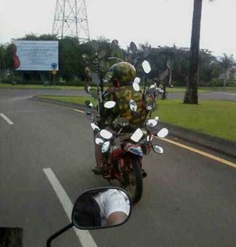 Tapi kadang ada orang-orang yang kepepet mengganti kaca spionnya dengan kaca lain nih. Ya kayaknya sih nggak ada fungsinya jatuhnya. Ada juga orang yang malah pasang spion dengan cara yang nyeleneh banget. Penasaran seperti apa? Yuk simak langsung saja...