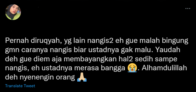 Yang Penting Heppiii. Bukan rahasia lagi kalau selain pengobatan medis, orang Indonesia suka melakukan ruqiah untuk menyembuhkan seseorang yang sedang sakit atau butuh pertolongan. Sayangnya, nggak semua proses ruqiah berjalan sesuai rencana. Simak sederetan kocak proses ruqiah yang pernah dialami netizen berikut ini.
