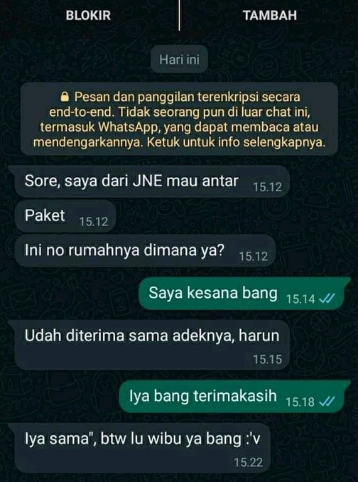 Berbelanja online sudah jadi kegiatan yang lazim bagi masyarakat di era modern seperti sekarang. Bahkan entah berapa kali kita mendengar suara kurir paket yang datang mengantarkan barang belanjaan ke rumah. Saking seringnya, bahkan ada yang sampai hafal suara motor atau suara kurir. Di samping itu, ada juga kurir yang mengirimkan pesan kepada penerima paket. Biasanya mereka menanyakan detail alamat penerima agar lebih mudah saat mencari. Niat hati tanya alamat lewat chat supaya mudah menemukan rumahnya, para kurir ini malah semakin dibuat bingung dengan balasan customer yang nggak jelas. Chat balasan penerima paket ini pun terkadang sukses bikin jengkel namun ngakak sekaligus. Seperti beberapa percakapan kurir dengan penerima paket berikut ini, Yuk Simak!