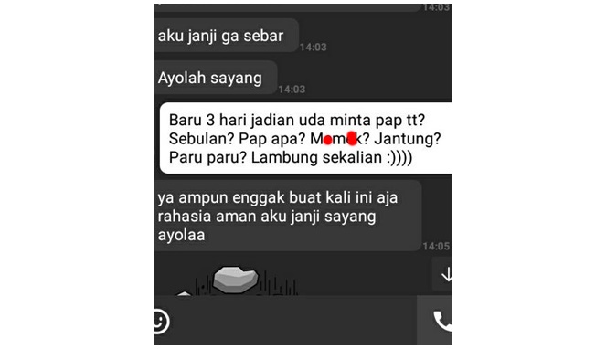 Seperti kasus ini yang viral beberapa waktu yang lalu. Ya, usut punya usut ternayta si bocil punya niatan lain dalam menjalin hubungan dengan pasangannya. Bahkan dirinya meminta pap mesum pada gebetannya itu..