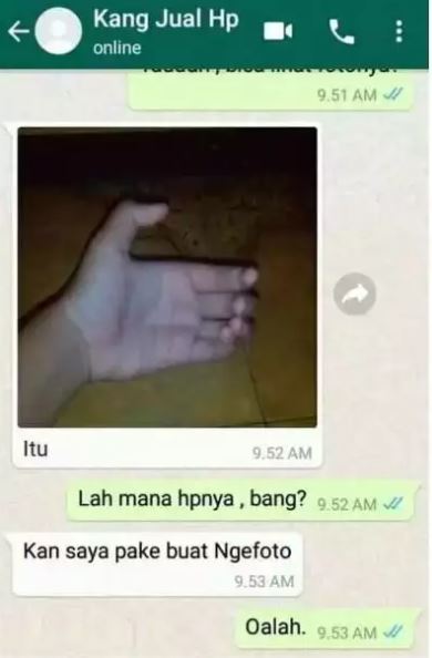 Yang Penting Heppiii. Sebelum terjadi deal transaksi di toko online, seringkali ada obrolan antara penjual dan pembeli. Itu merupakan hal yang wajar, karena pembeli pasti ingin mendapatkan informasi yang lengkap mengenai barang yang akan dibeli, terutama karena nggak bisa melihat barangnya langsung. Kocaknya, dalam chat antara pembeli dan penjual, sering banget terjadi obrolan yang menggelitik, kaya yang berikut ini.