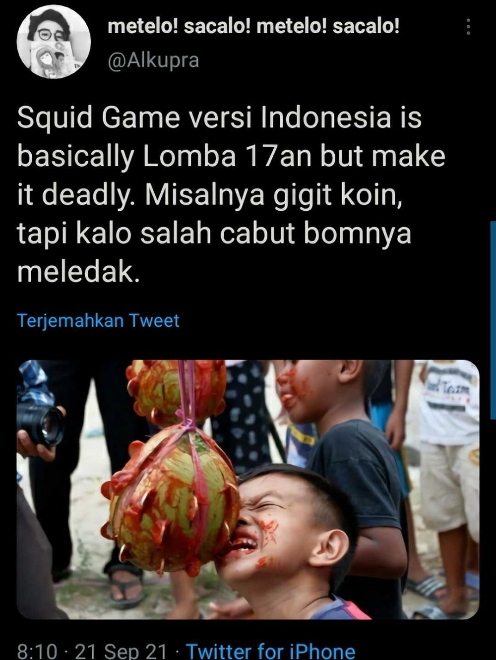 Bukan netizen Indonesia namanya jika tak bisa mengubah ketegangan drama Squid Game menjadi lelucon pada tweet di platform Twitter. Dari mulai saran tempat dan lagu Squid Game versi lokal, penasaran? Yuk simak aja langsung..