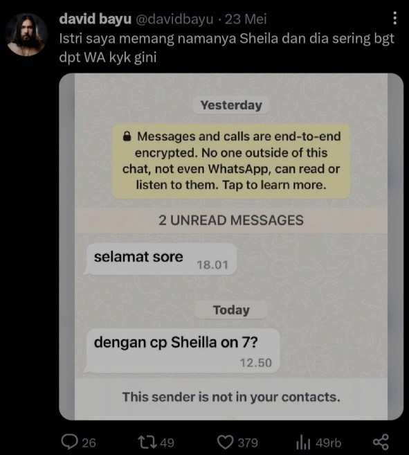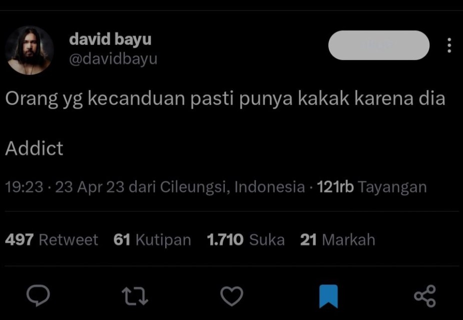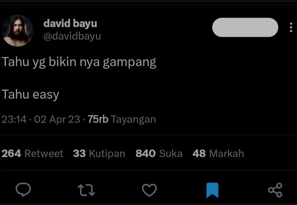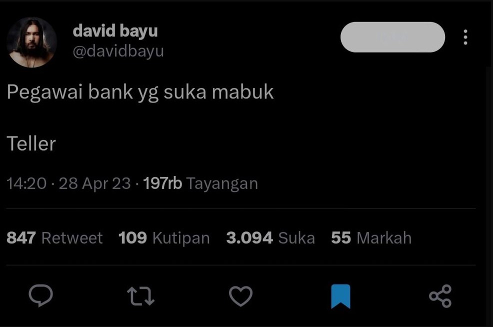 Siapa yang tak kenal dengan David Bayu? Kiprahnya lewat band Naif membuat namanya semakin dikenal masyarakat Indonesia. Meski tak lagi bergabung dalam grup band tersebut, ia masih aktif bersolo karier sampai sekarang. Sebagai seorang personel band, banyak yang tak menyangka bahwa David Bayu punya selera humor yang kocak. Seperti cuitannya lewat akun Twitter ini..