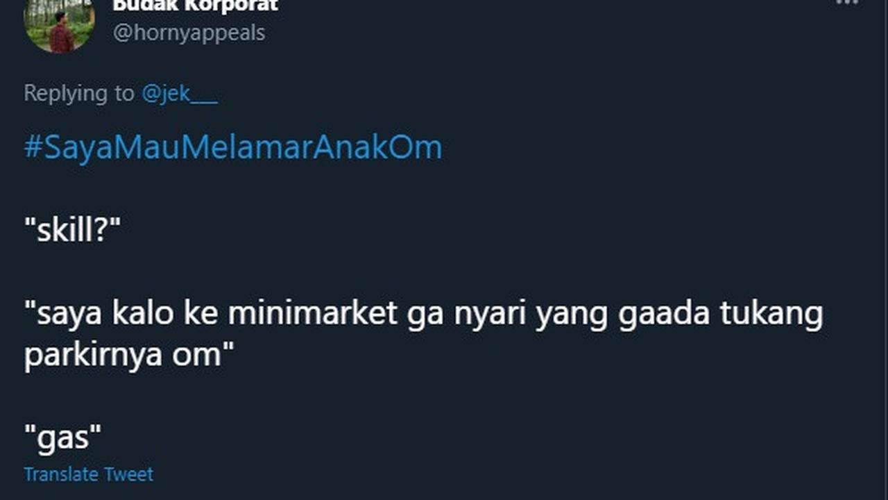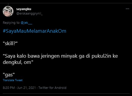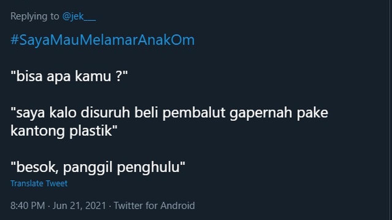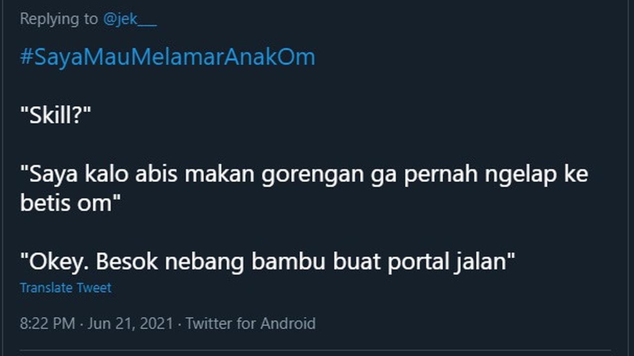 Namun dengan pamer sebuah keahlian mungkin saja bisa diterima oleh calon mertua, seperti cuitan kocak yang beberapa waktu ini viral di media sosial Twitter. Hashtag #SayaMauMelamarAnakOm, beberapa waktu belakangan ini sempat trending, cukup banyak netizen membagikan idenya saat pamer keahlian di depan mertua. Tapi justru keahlian yang dipamerkannya ini bikin kita melongo dan ketawa, penasaran seperti apa? yuk simak langsung saja..