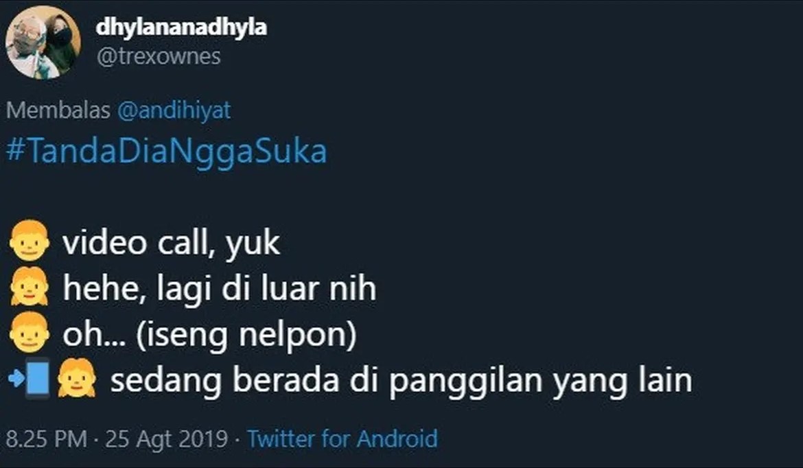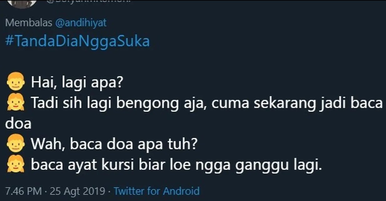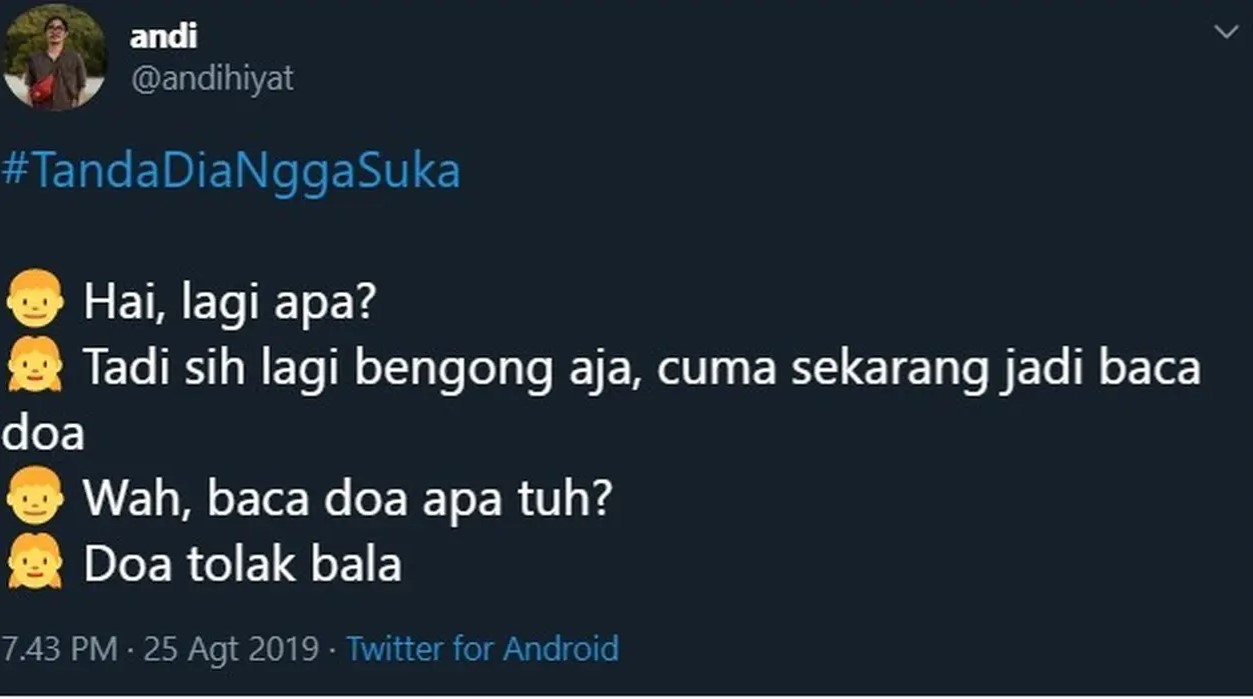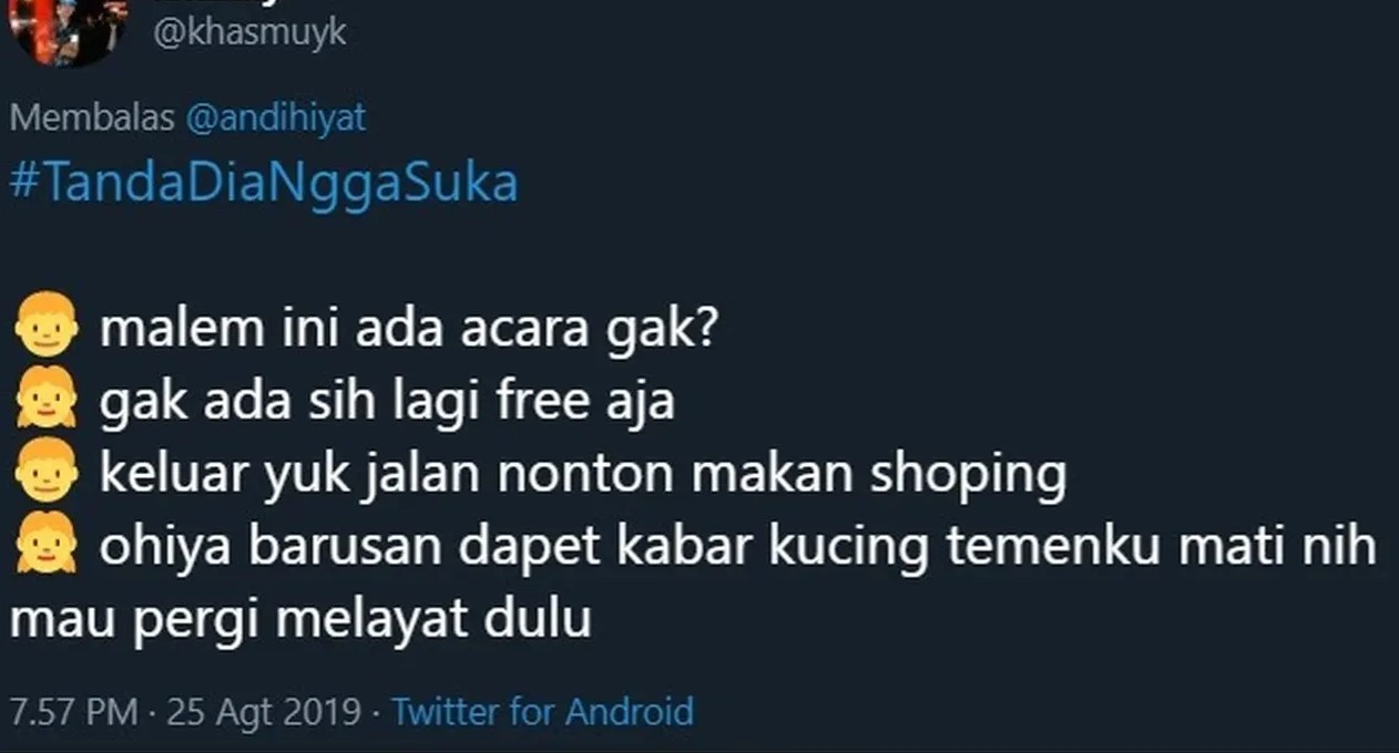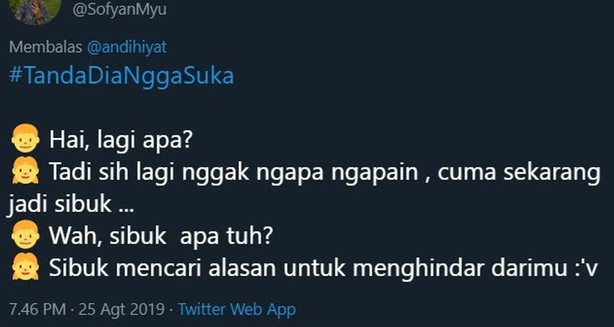 Mencari tahu jika seseorang tertarik atau menyukai kamu atau tidak bukanlah suatu perkara yang mudah. Itu sebabnya mengetahu sinyal-sinyal dari bahasa tubuh sangat membantu. Langkah utama yang kerap dilakukan dalam masa pendekatan ialah sering berkomunikasi lewat chat. Sayangnya tak semua masa pendekatan tersebut berakhir mulus, banyak pula loh yang justru ditolak terang-terangan atau secara halus oleh gebetan. Seperti kumpulan cuitan netizen yang trending dan kocak soal tanda gebetan ngga suka kamu ini bikin tepuk jidat.