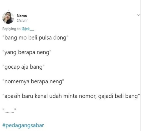 Menjadi seorang pedagang tentu harus selalu sabar menghadapi berbagai tingkah laku pembeli. Pasalnya semua pedagang tentu akan menemui pembeli dengan sifat yang berbeda-beda setiap harinya. Tak sedikit pembeli yang cukup menjengkelkan sehingga benar-benar menguji kesabaran sang pedagang. Potret dibawah ini.
