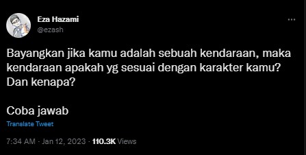 Media sosial saat ini digunakan bukan hanya untuk bersosialisasi saja lho. Saat ini, media sosial juga banyak digunakan untuk saling berbagi pengalaman atau bahkan berbagi canda serta kreativita. Seperti Cuitan berikut ini tentang gambaran kendaraan yang sesuai dengan karakter netizen yang jawabannya digunakan untuk curhat-curhat colongan dan bikin ngakak, penasaran? Yuk Simak beberapa cuitanya berikut ini, yuk!