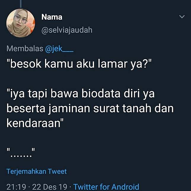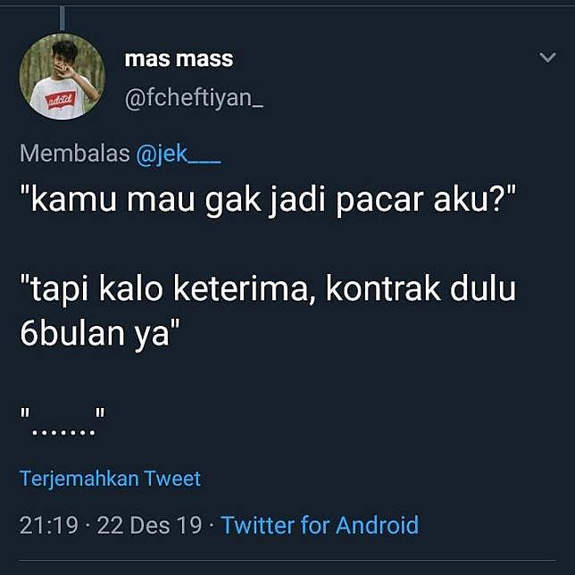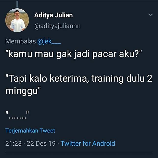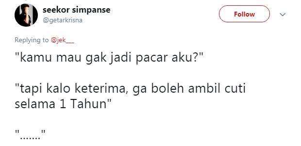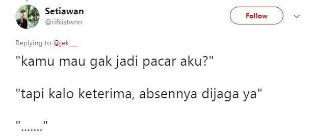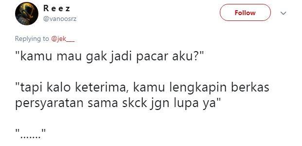 Tapi apa jadinya jika kita katakan cintah pada gebetan malah diberikan syarat – syarat yang nyeleneh dan bikin ngakak. Seperti cuitan dibawah ini yang dimana nembak cewek malah diberikan syarat seperti orang saat test interview..