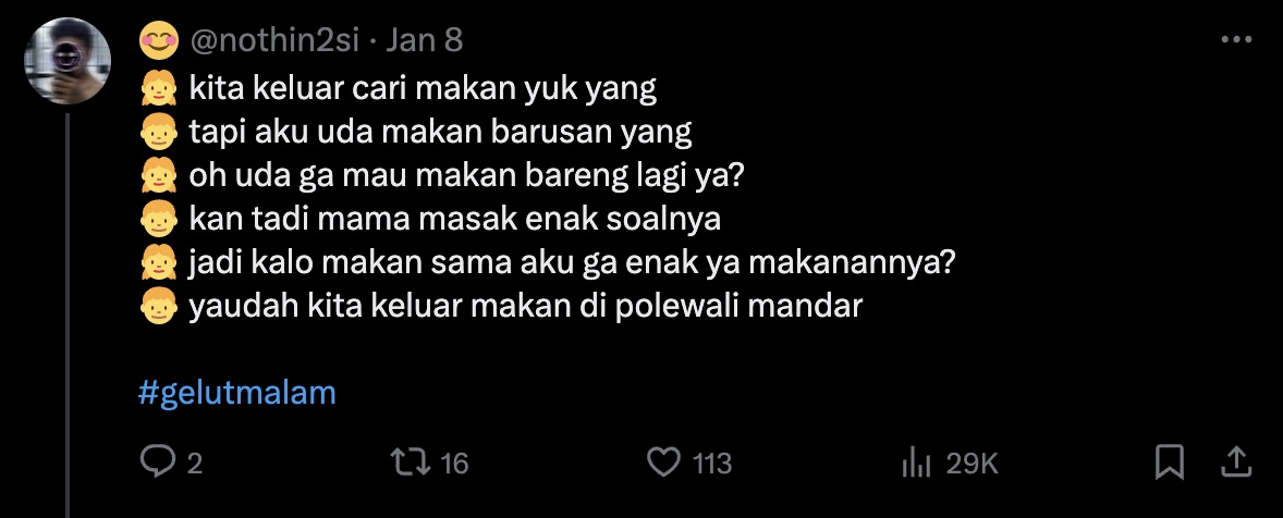 Setiap pasangan tentu memiliki konflik masing-masing. Tak sedikit yang kerap bertengkar lantaran berbeda pendapat. Perbedaan pendapat tentu menjadi hal yang lumrah terjadi pada pria dan wanita dalam sebuah hubungan. Seperti tweet nyeleneh perdebatan receh pasangan kekasih degan hastag #gelutmalam. Unggahan mengenai perdebatan nyeleneh ini diawali dari sebuah tweet pemilik akun Twitter @jek___ dan banyak netizen yang meresponnya juga dengan percakapan kocak. Yuk simak!