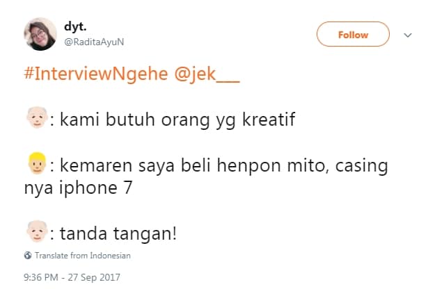 Tapi apa jadinya jika pertanyaan-pertanyaan tersebut malah dijawab dengan nyeleneh alias asal seperti cuitan dibawah ini yang menggambarkan moment saat test interview dan menjawab dengan santuy dan nyeleneh yang membuat kita ngakak membayangkannya