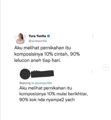 Yura Yunita dikenal sebagai seorang penyanyi bersuara emas dan lagu-lagunya mampu menyentuh hati banyak orang hingga meneteskan air mata. Beberapa hari yang lalu, pelantun lagu 'Dunia Tipu Tipu' tersebut mengunggah sebuah cuitan pendek di akun Twitternya. Dalam cuitan itu, Yura membahas soal konsep pernikahan dan banyak direspon netizen dengan tweet serupa yang kocak. Penasaran seperti apa cuitan netizen? Yuk cek langsung dibawah ini