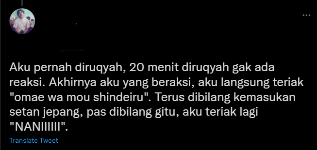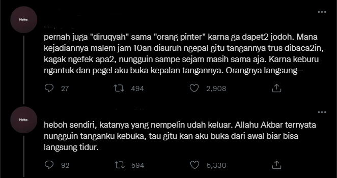 Rukiah merupakan salah satu metode penyembuhan dan upaya meminta pertolongan melalui bacaan doa. Tapi, sayangnya di Indonesia sendiri rukiah sering dilakukan sama seseorang yang kurang tepat dengan tindakan yang cenderung nyeleneh. Bahkan ada yang menganggap kalau rukiah akan berhasil kalau si pasien muntah atau menangis histeris. Padahal poin penting dalam rukiah itu adalah bacaan dan lantunan doa dari surat-surat di kitab suci. Seperti beberapa pengalaman warganet saat dirukiah yang bukannya bikin haru tapi malah bikin ketawa, penasaran? Yuk lihat deretannya..