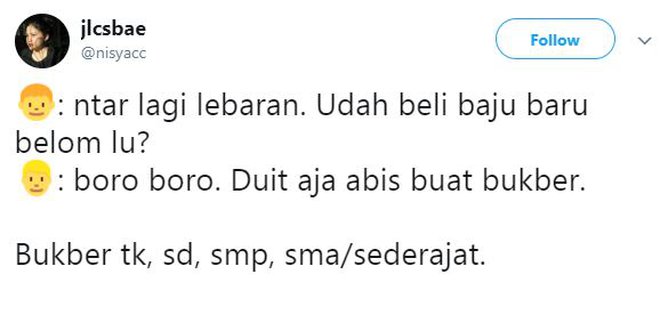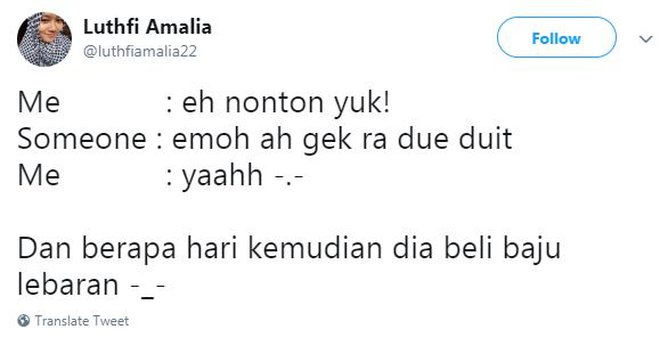 Lebaran identik dengan belanja baju baru. Ini sudah jadi tradisi orang Indonesia. Memakai baju baru saat lebaran bikin suasana jadi lebih hangat dan nyaman, meskipun nggak wajib juga sih. Kalau ada rezeki lebih, bolehlah ya nambah koleksi isi lemari baju. Nah, fenomena Lebaran dan belanja baju bikin warganet akhirnya banyak yang meluapkan perasaan di Twitter. Menariknya, banyak cuitan kocak sekaligus bikin berkata "oh iya ya”. Seperti deretan dibawah ini, penasaran? Yuk Simak!