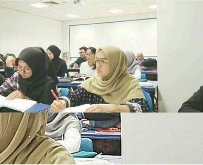 - Ketika di zoom ternyata di bawah meja ada kepala salah satu mahasiswi yang sedang tertidur pulas.