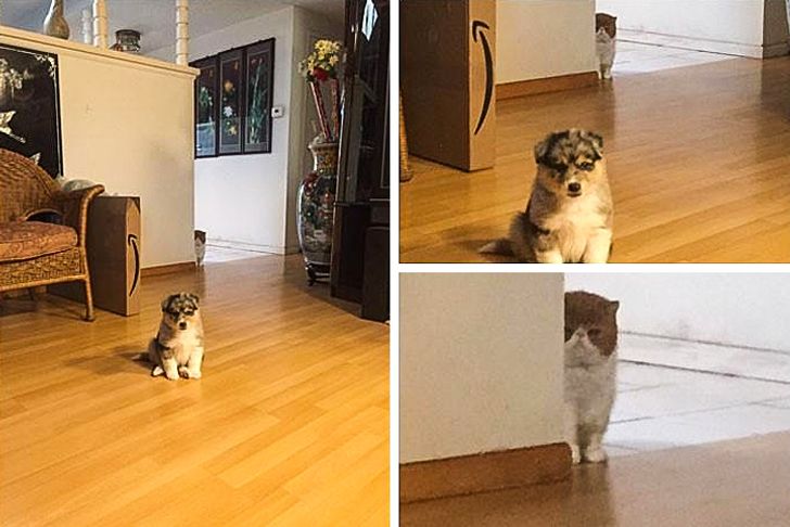 - Ada kucing yang lagi ngumpet dari anjing kecil ini