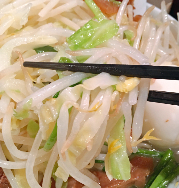 Nggak, kamu nggak akan makan ramen cuman kuahnya aja kok, tapi mie yang ada di tempat ini diganti dengan semangkuk toge Jepang. Selain toge Jepang, satu porsi ramen ini berisi sayuran, dan telur rebus.