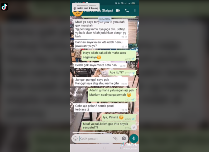 biasanya kita tidak pernah mengetahui seberapa jauh - dekat, muda - tua, jodoh kita nantinya. Seperti cerita seorang mahasiswi yang tiba-tiba dilamar oleh dosen pembimbing skripsinya via chat. Yang lantas membuat mahasiswi tersebut kaget, karena merasa tidak pernah dekat dengan dosennya tersebut.