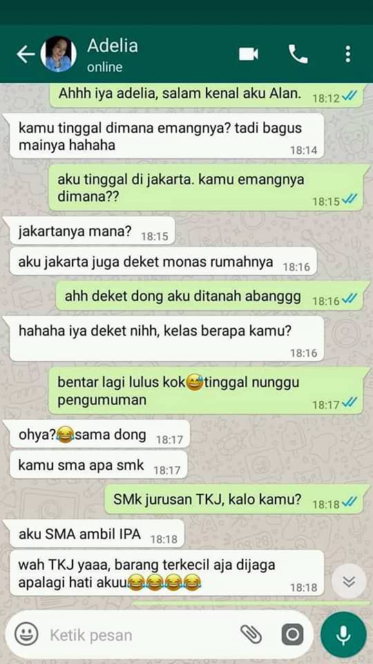 Awalnya Adelia menanyakan alamat rumah Alan. Lalu bertanya sekolah di mana. Ia juga mengaku sebagai anak SMA.