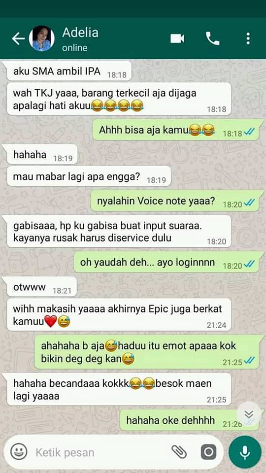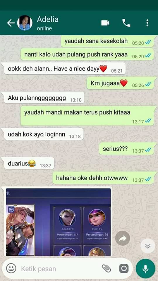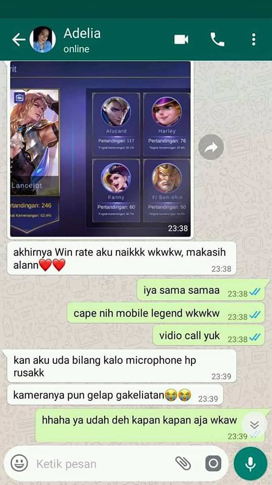 Dari perkenalan ini, bisa jadi hubungan akan berlanjut. Seperti kisah Alan dan Adelia yang berkenalan dari Mobile Legends ini. Melansir dari Tribun Style, ada sebuah tangkapan layar percakapan Alan dan Adelia yang diunggah oleh akun Facebook Ade Pranata pada 29 April 2018.