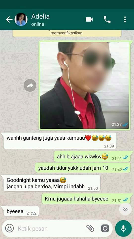 Alan pun memberikan fotonya. Adelia memuji tampang Alan yang disebutnya ganteng. Lalu percakapan mereka berakhir dengan ucapan selamat tidur.